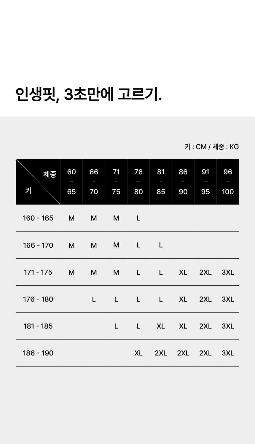 | 키/체중 | 60 - 65 | 66 - 70 | 71 - 75 | 76 - 80 | 81 - 85 | 86 - 90 | 91 - 95 | 96 - 100 |