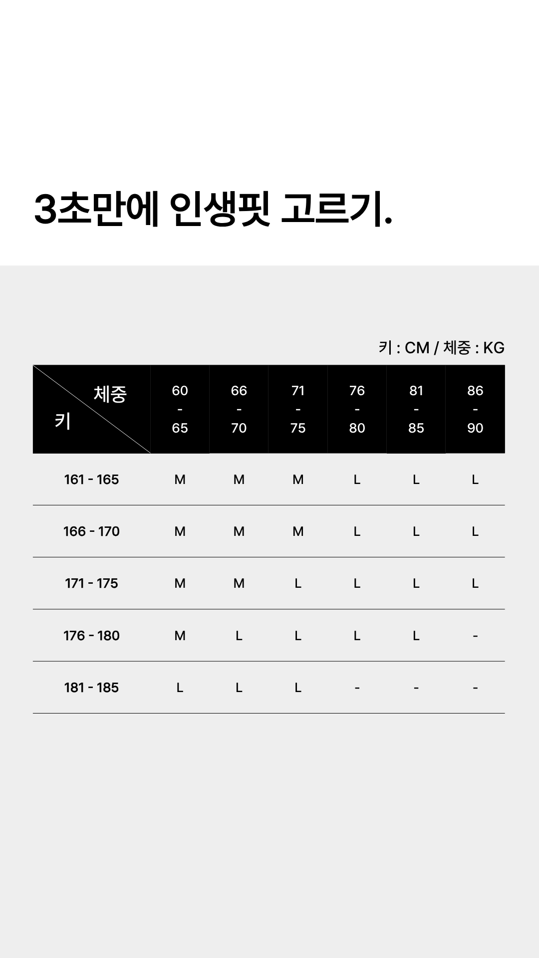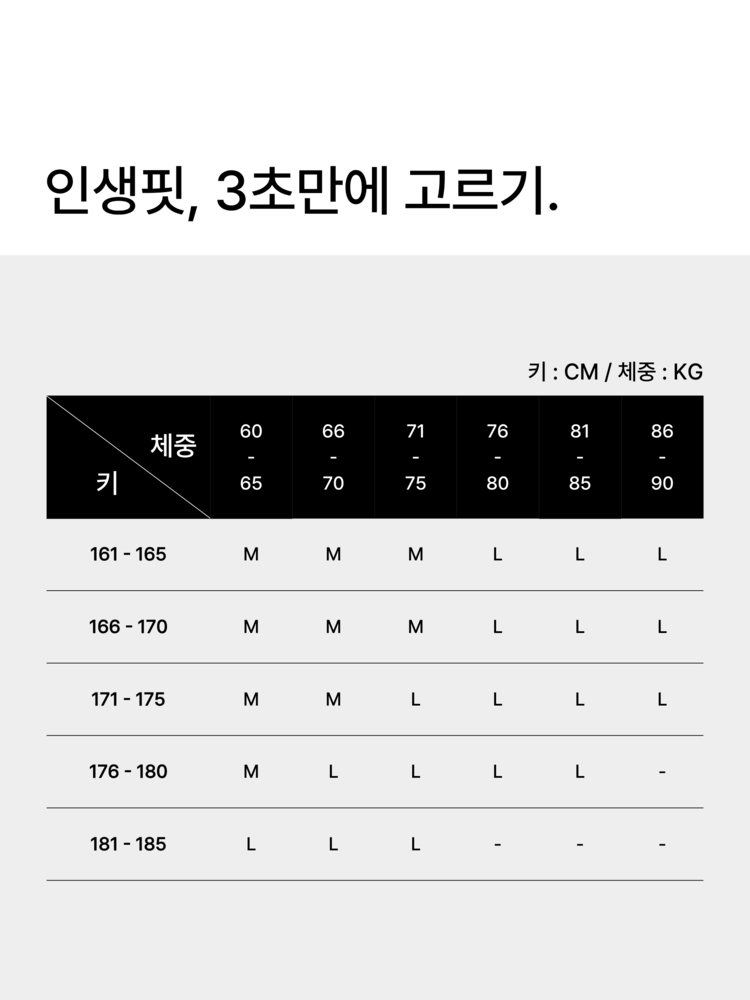 | 키/체중 | 60 - 65 | 66 - 70 | 71 - 75 | 76 - 80 | 81 - 85 | 86 - 90 |