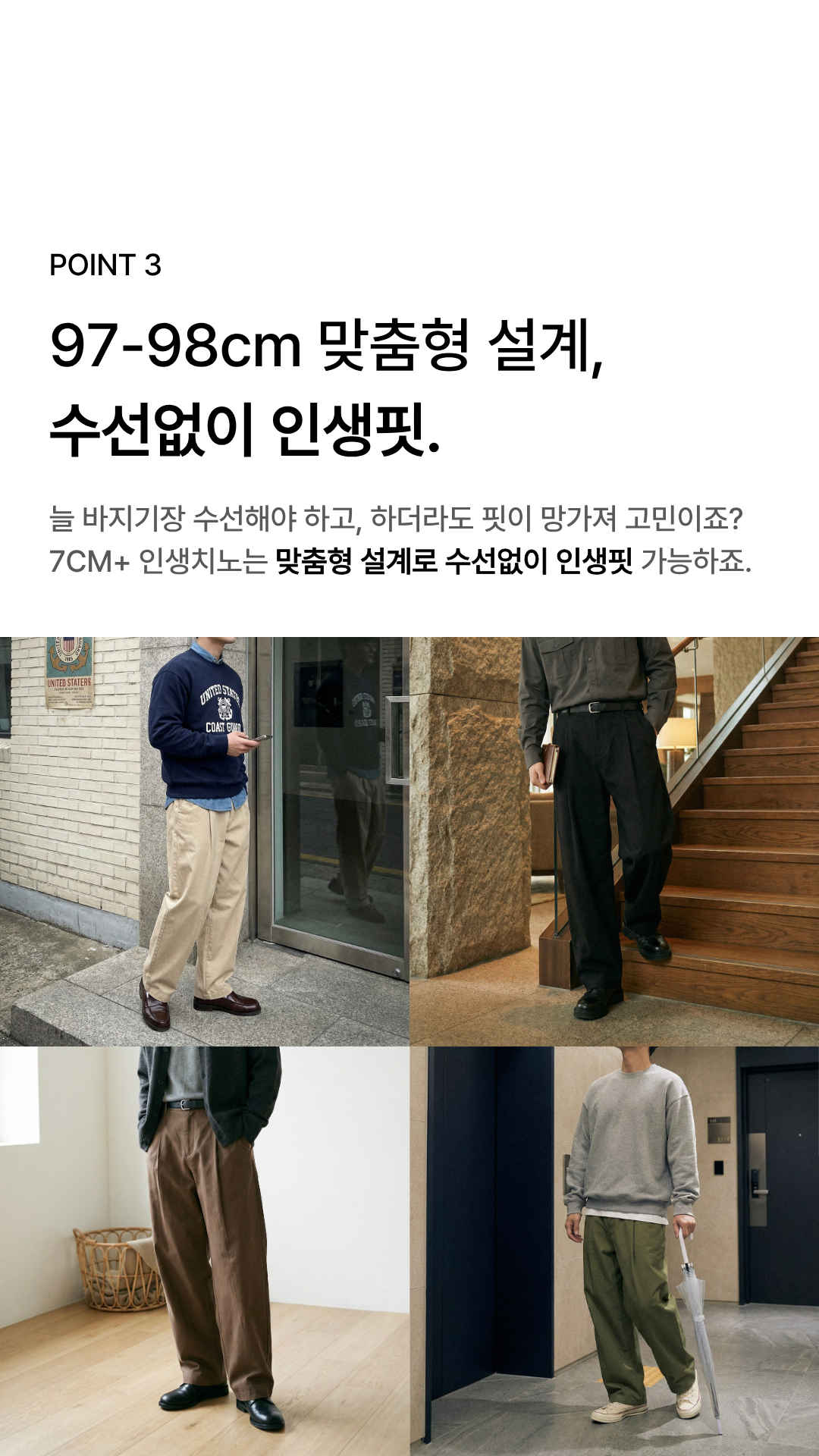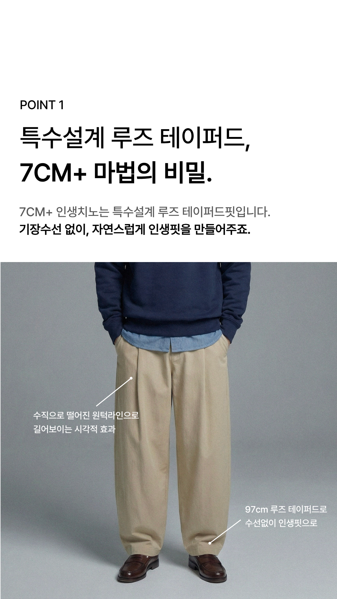 - 비율을 개선해주는 와이드 테이퍼드 핏
