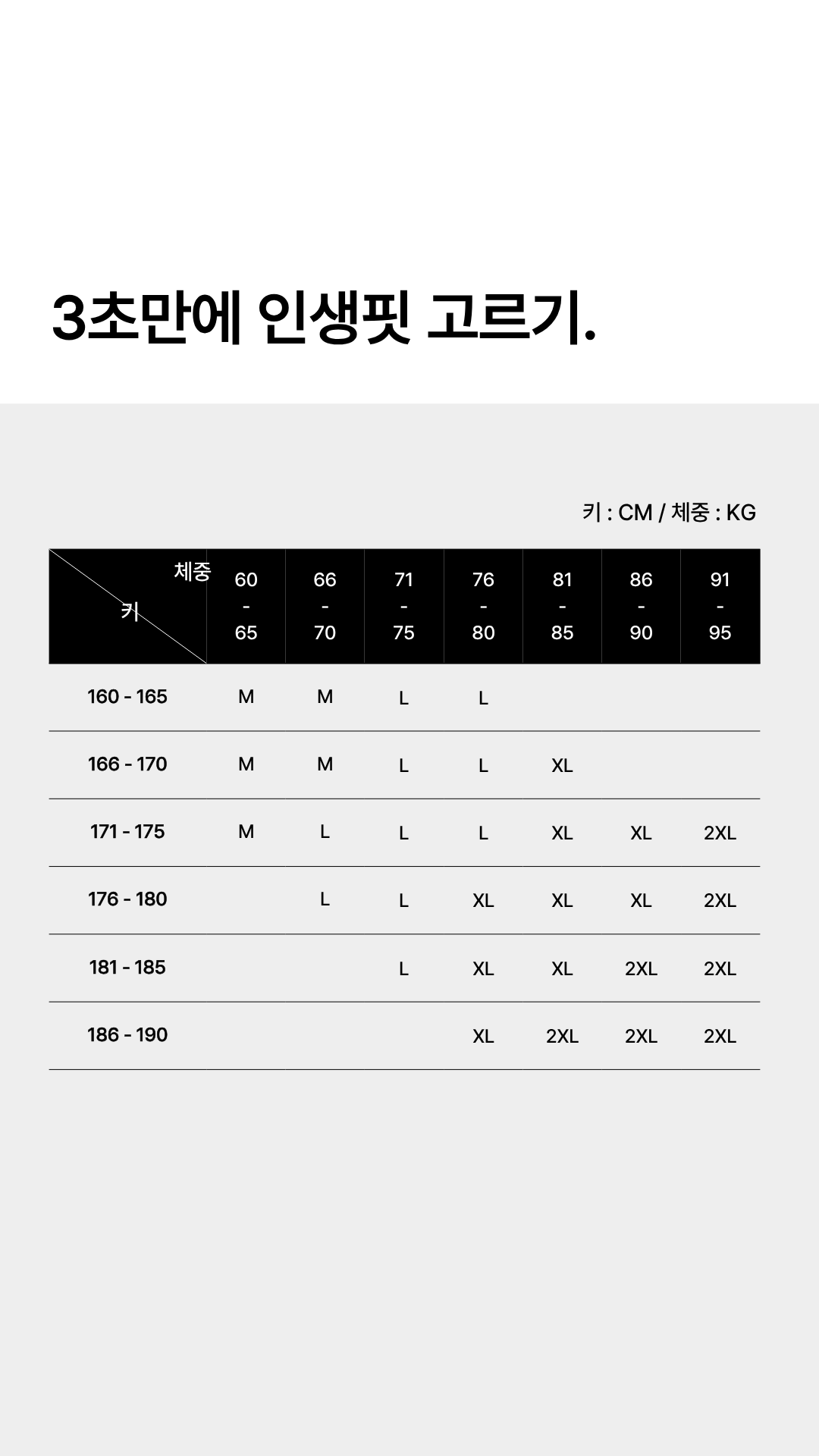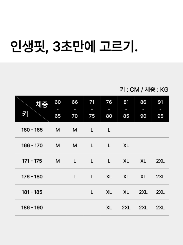 | 키/체중 | 60 - 65 | 66 - 70 | 71 - 75 | 76 - 80 | 81 - 85 | 86 - 90 | 91 - 95 |