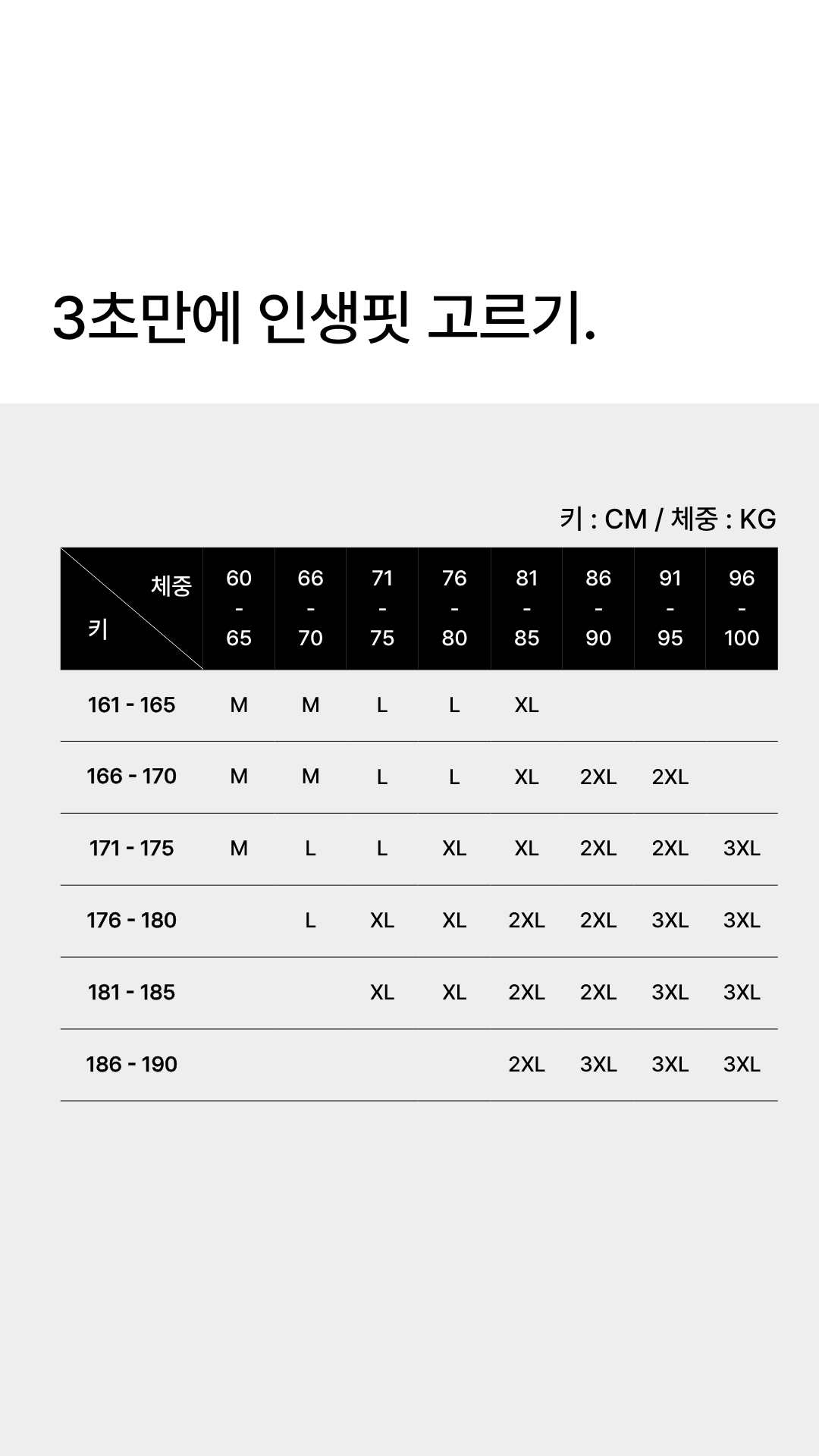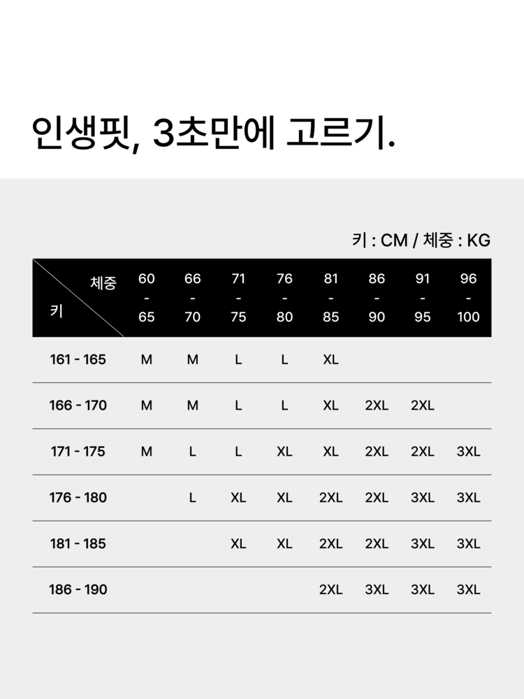 | 키/체중 | 60 - 65 | 66 - 70 | 71 - 75 | 76 - 80 | 81 - 85 | 86 - 90 | 91 - 95 | 96 - 100 |